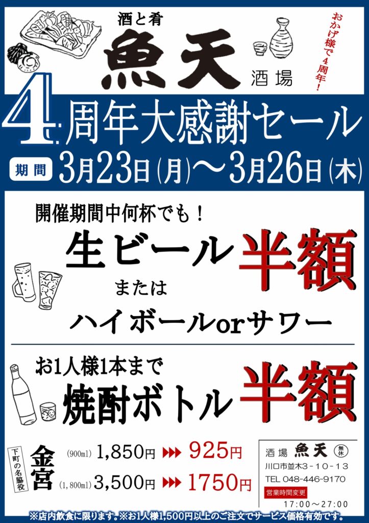 魚と肴 魚天 4周年記念大感謝セール実施!